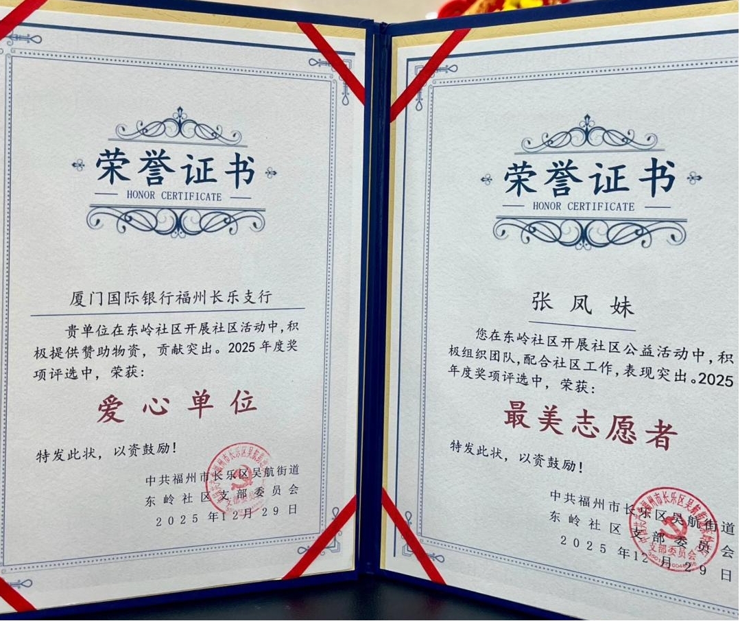 厦门国际银行福州长乐支行成立志愿小队,参与服务了“社区之家-读书会”“长乐故事传薪火-故事会”“金融护苗”等项目,其中员工张凤妹累计志愿服务时长达500余小时,其表现得到东岭社区高度认可,被赞为“银社协同合作、服务民众生活的典范”。2025年末,厦门国际银行福州长乐支行荣获东岭社区“优秀共建单位”称号,员工张凤妹获评“最美志愿者”。