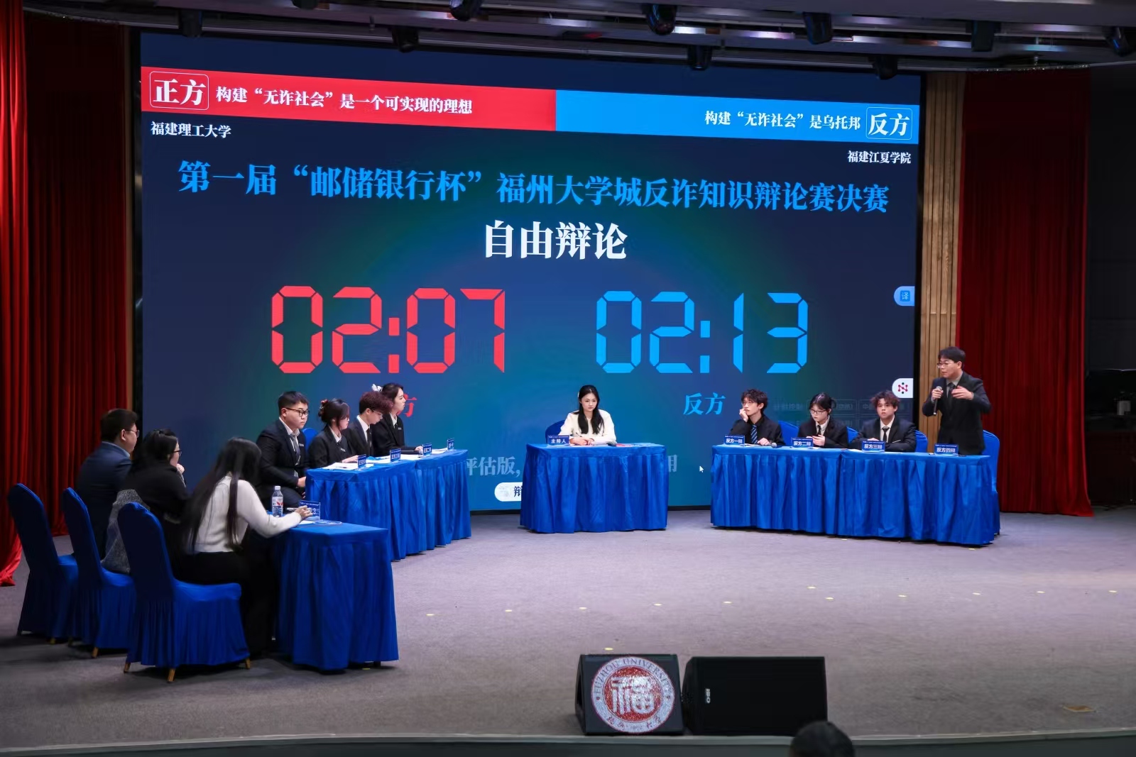 第一届 “邮储银行杯” 福州地区大学城反诈知识辩论赛总决赛,近日在福州大学圆满举行。本次大赛以 “思辩明理,反诈同行” 为主题,由福州市公安局上街(高新区)分局、福州大学法学院、邮储银行福州市分行联合举办,联动辖区16所高校共同参与,旨在通过创新宣传形式,强化高校师生电信网络诈骗防范意识与能力,筑牢校园金融安全防线,厚植 “全民反诈、全社会反诈” 的浓厚氛围。