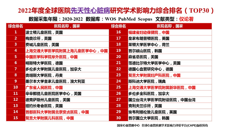 近日,国家心血管病中心主办的中国心脏病大会召开,发布了由国家心血管病中心主导制定的“全球心血管疾病学术影响力评价平台(CAPE)”。福建省妇幼保健院、福建省儿童医院在《2022年度全球医院先天性心脏病研究学术影响力综合排名》中位居全球第十六,全国第六,全国妇幼专科医院第一,成为唯一入选TOP20的妇幼专科医院。