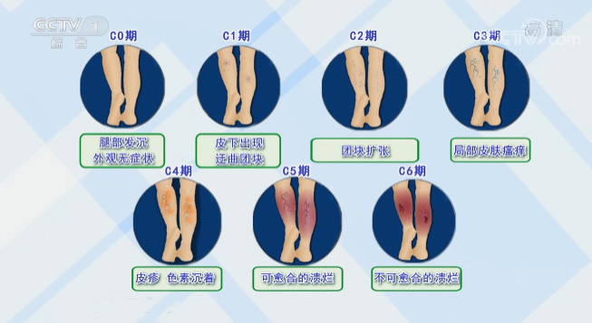 夏天的时候,有时走在大街上都可以看到有些人的小腿上有曲折状的静脉,这就是静脉曲张的表现。但其实,静脉曲张的发生在这之前就已出现。静脉曲张分7期,从C0期到C6期,C0期病人有腿沉的症状,但外观上没有任何表现,难以发现。这部分人群基数最大。随着疾病的发展,逐渐出现小的曲张的团块、团块逐渐增大,到最后导致皮肤出现营养障碍,出现了瘙痒、皮疹,甚至溃烂、不愈合。