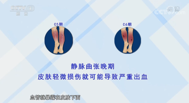 一般来说,到了C5、C6期就有大面积出血的危险,在这之前静脉曲张对于皮肤的损害还比较小,皮肤还比较结实。随着静脉曲张进展,皮肤越来越薄,血管就暴露在皮肤下面,没有什么防护,稍微一碰就破了,出血就很大。