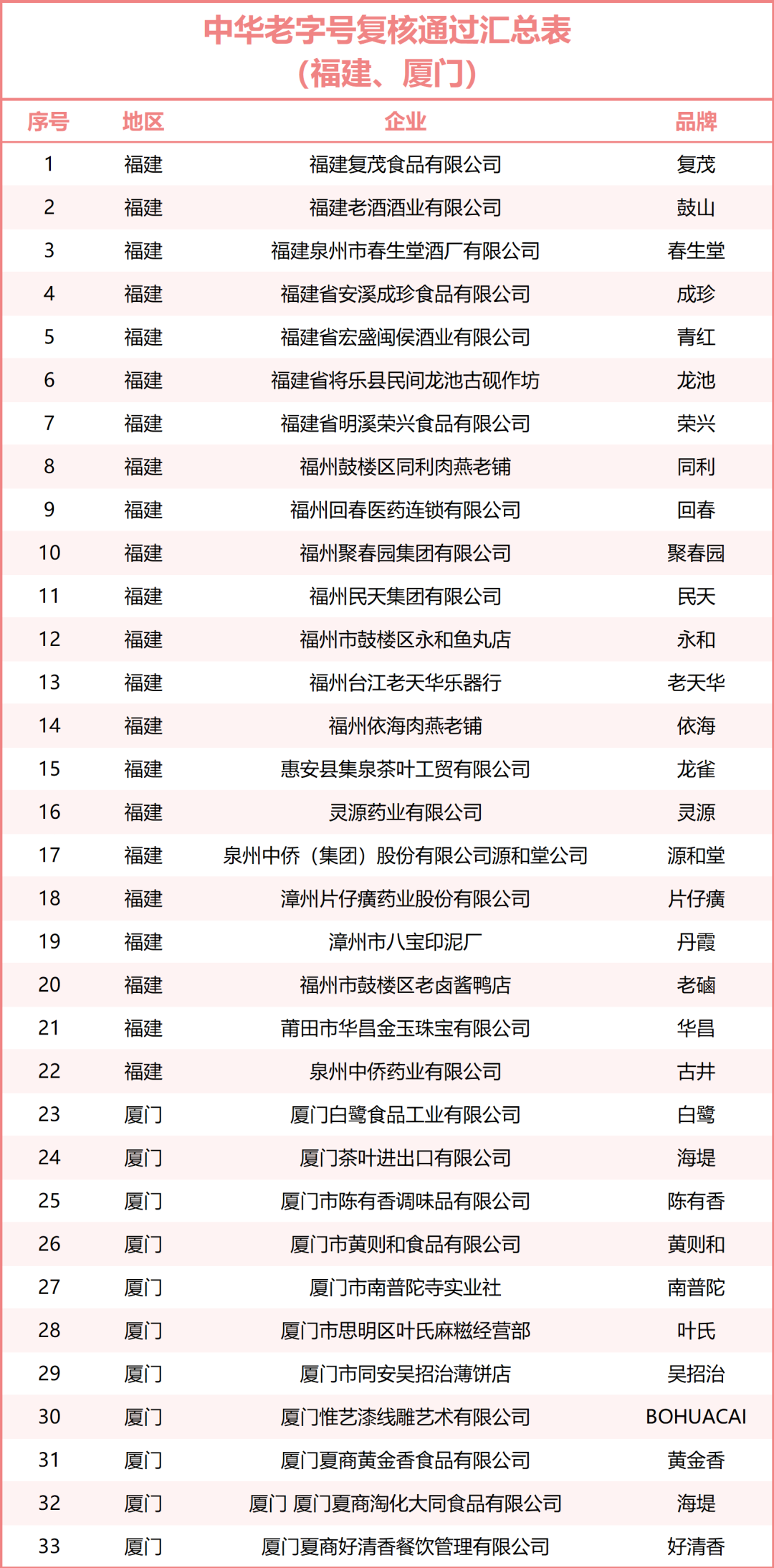 福建(含厦门地区)共33家通过中华老字号复核,名单如下: