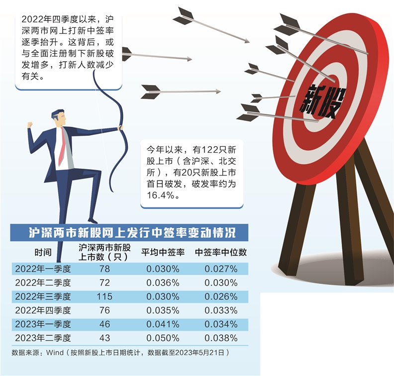 证券时报记者统计发现,2022年三季度以来,沪深两市网上打新中签率逐季抬升。在这背后,或与全面注册制下新股破发增多,打新人数减少有关。