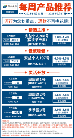 比如,河北银行主推“安益个人208号(国庆节专属)”理财产品,该产品5万起购,为中低风险产品,募集期为9月27日至10月8日。