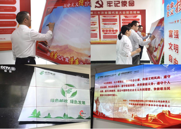 此外,邮储银行宁德市分行还充分发挥营业网点优势,利用各支行网点门楣屏、办公场地等宣传载体,滚动播放社会主义核心价值观宣传标语、《小邮话廉》微动漫视频。同时在机关大楼显示屏上播放邮政绿色公益片,积极宣传文明出行、绿色出行。
