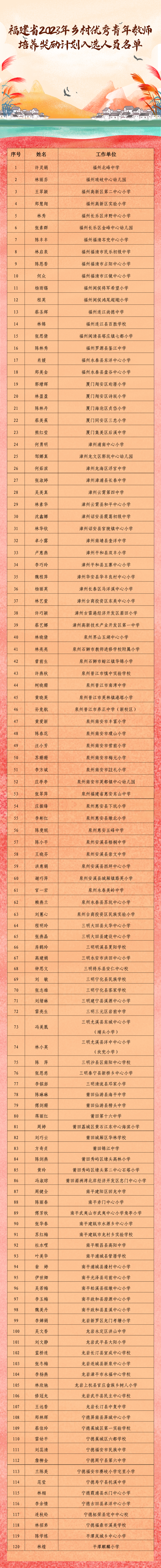 日前,福建省教育厅印发《关于公布2023年乡村优秀青年教师培养奖励计划入选人员名单的通知》,确认许灵娟等120名教师为福建2023年(总第六批)乡村优秀青年教师培养奖励计划人选。