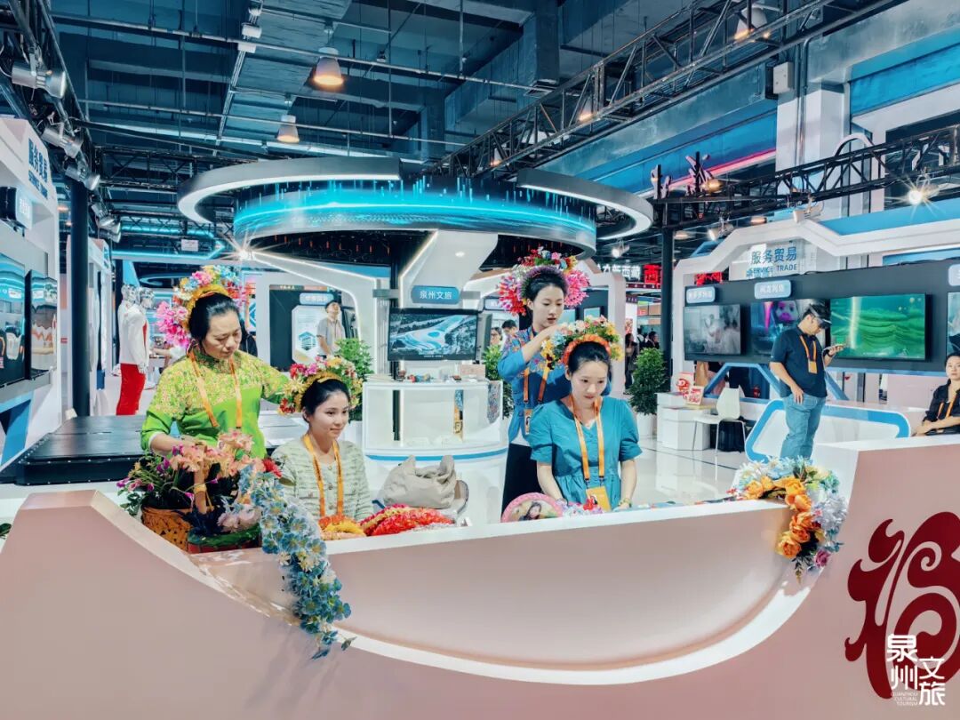 活动现场气氛热烈、热闹非凡。在福建馆内,泉州推出“簪花围”体验服务,“簪花热”的风吹到了首都北京,不少游客与来宾亲身参与,在沉浸式体验中感受这项非遗文化的独特之处。