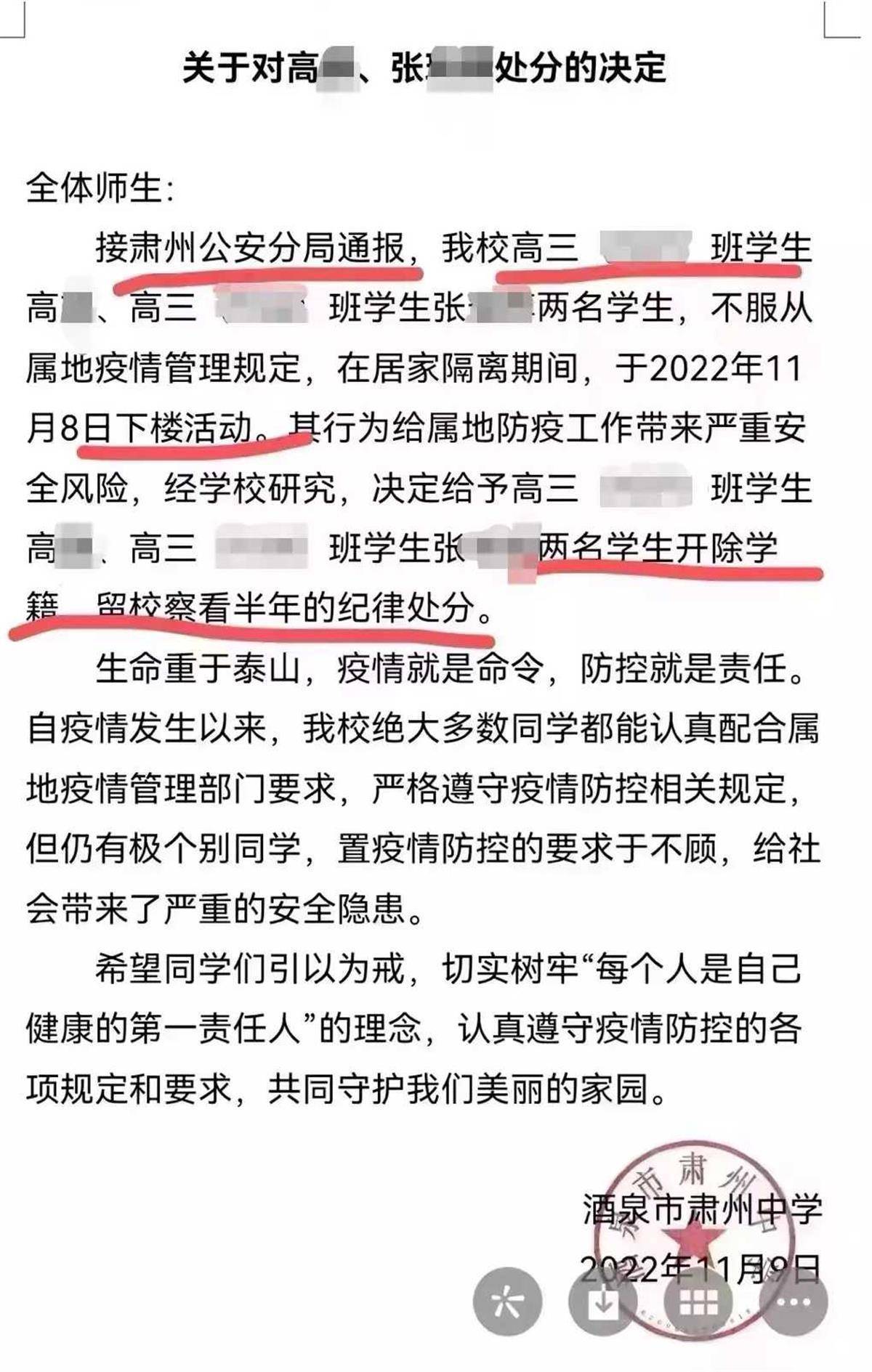 此前,酒泉市肃州中学一份《关于对高某、张某某处分的决定》内容显示,接肃州公安分局通报,酒泉市肃州中学高三学生高某、张某某,不服从属地疫情管理规定,在居家隔离期间,于2022年11月8日下楼活动。学校认为,上述两名学生的行为给属地防疫工作带来严重安全风险,经学校研究,决定给予高某、张某某两名学生开除学籍、留校察看半年的纪律处分。