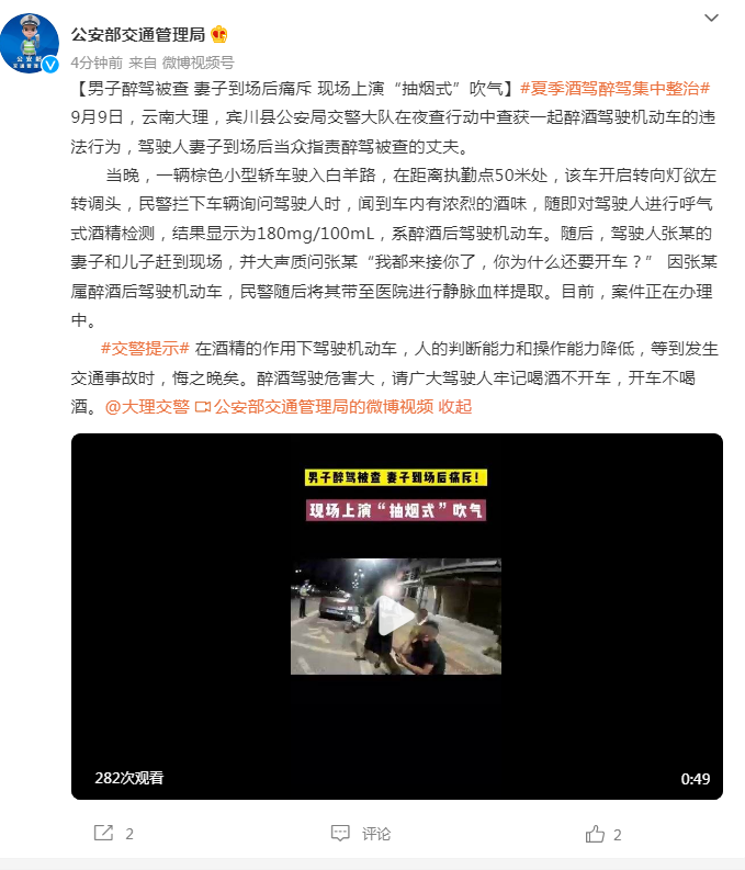 近日,云南大理,宾川县公安局交警大队在夜查行动中查获一起醉酒驾驶机动车的违法行为,驾驶人的妻子到场后当众指责醉驾被查的丈夫。