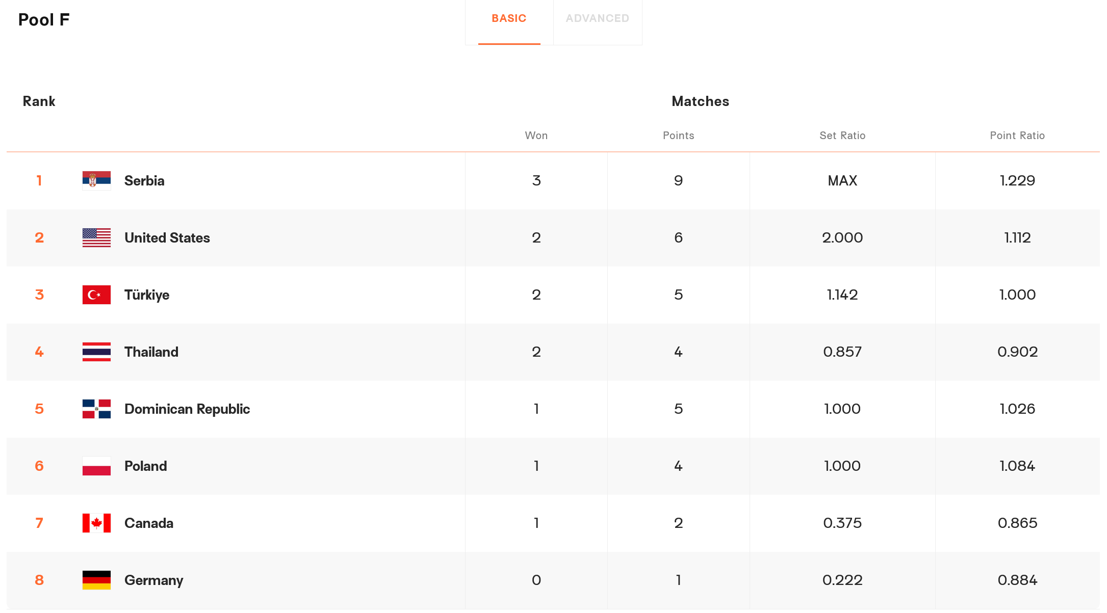 另外一个半区,第一阶段全胜的塞尔维亚队暂居F组第一,美国、土耳其和泰国分列二到四位。