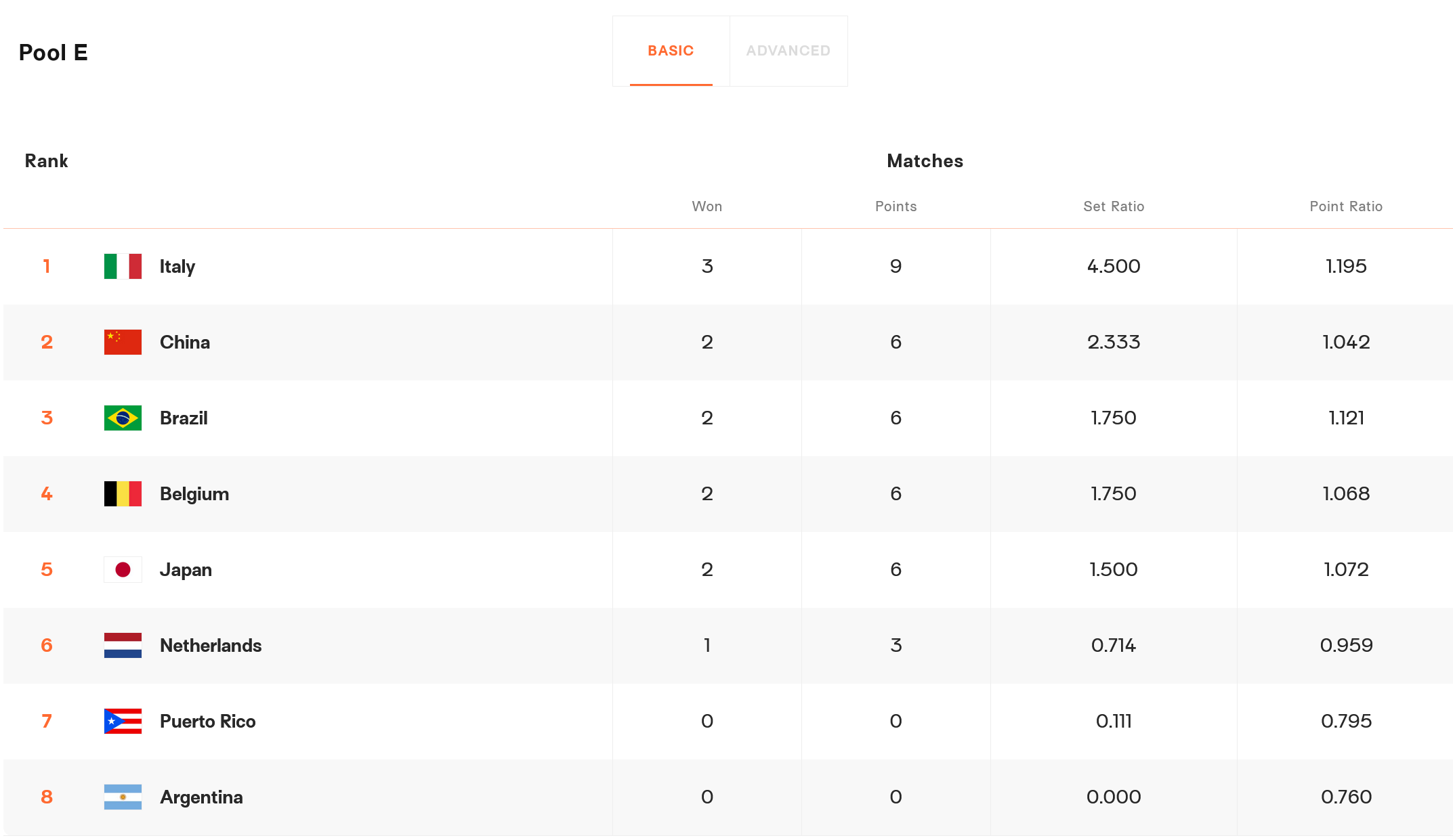 中国女排第一阶段所在的D组前四名(中国、日本、巴西、阿根廷)与A组前四名(意大利、比利时、荷兰、波多黎各)组成E组。按照赛事规则,第一阶段同组的球队在第二阶段不再交手,而是直接带入第一阶段交手的成绩。由此,第一阶段取得全胜的意大利队带入3个胜场、9个积分,排名E组第一;中国队第一阶段战胜了日本和阿根廷,输给了巴西,因此带入2个胜场、6个积分,暂列E组第二。