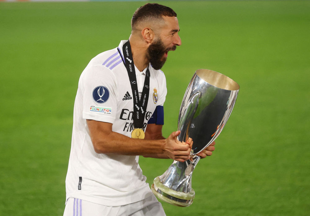8月10日,在2022年欧洲超级杯足球赛决赛中,西甲皇家马德里队以2:0战胜德甲法兰克福队。本泽马捧杯庆祝。新华社/路透