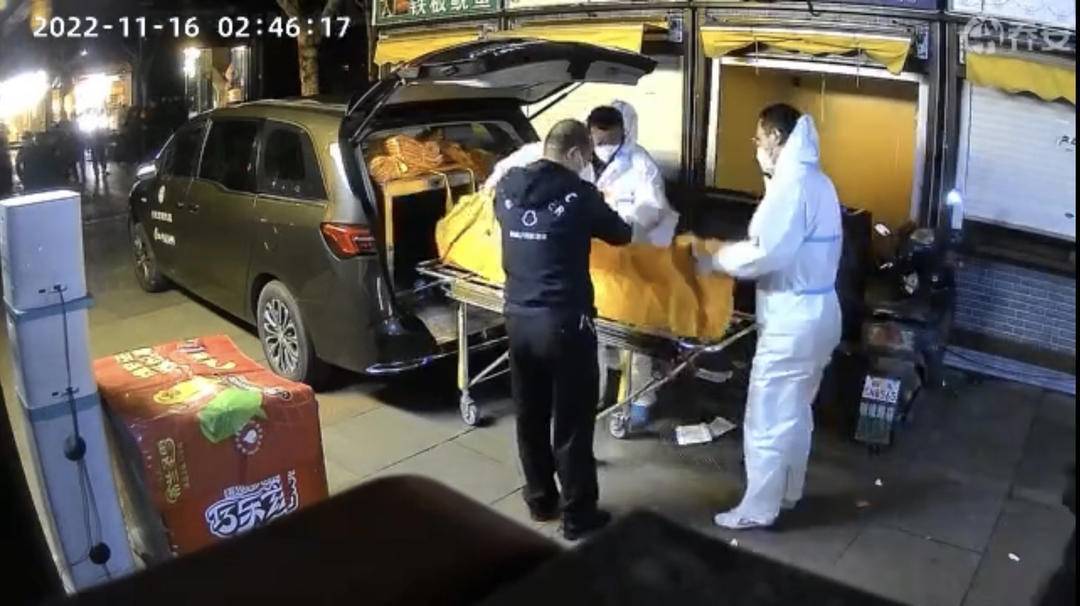 记者获取到的一份监控视频显示,11月16日凌晨2点45分左右,有身穿白色防护服的人员从涉事小商铺内,用黄色袋子将疑似尸体的物体打包装进配有专业设备的车中。有店铺老板称,确实在前天就听到消息,17日那天是法警过来勘查现场。
