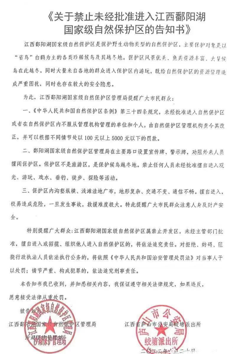 近日,江西鄱阳湖保护区管理局沙湖站、庐山公安局蛟塘派出所联合发布禁止未经批准进入鄱阳湖国家级自然保护区的告知书,违者最高处5000元的罚款。
