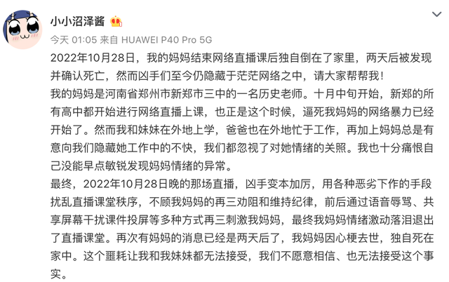 刘老师的女儿@小小沼泽酱 发文称:“10月中旬开始,新郑三中开始网络直播上课,也正是这个时候,逼死我妈妈的网络暴力已经开始了。10月28日晚的那场直播,凶手变本加厉,用各种恶劣下作的手段扰乱直播课堂秩序,不顾我妈妈的再三劝阻和维持纪律,前后通过语音辱骂、共享屏幕干扰课件投屏等多种方式再三刺激我妈妈,最终我妈妈情绪激动落泪退出了直播课堂。在结束课堂后,学生们都说她‘生气了’‘失踪了’。两天后被发现因心梗去世。