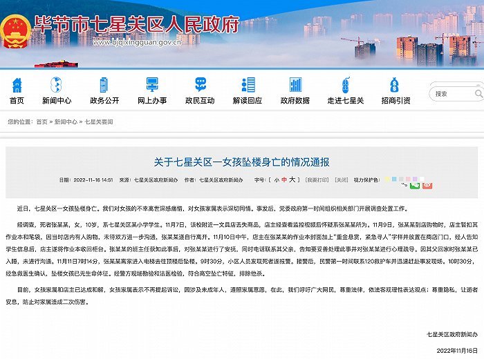 据贵州省毕节市七星关区政府网站11月16日消息,近日,七星关区一女孩坠楼身亡。我们对女孩的不幸离世深感痛惜,对女孩家属表示深切同情。事发后,党委政府第一时间组织相关部门开展调查处置工作。