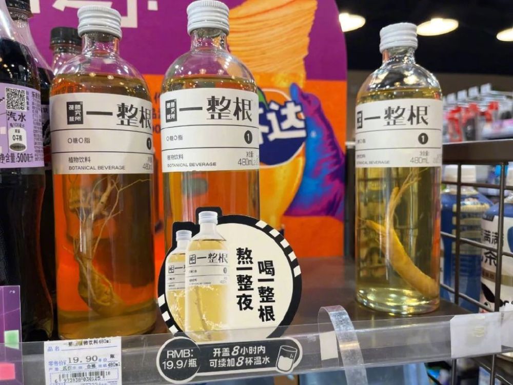 近段时间以来,一款名为“一整根熬夜水”的饮品在社交媒体上走红了。从外观上看,这款饮料直接将一整根人参放进玻璃瓶里。产品信息显示,人参为5年及5年以下人工种植人参,产地为长白山。除此之外,“一整根”的配料还有杭白菊以及茉莉花,是“0糖0脂”的“植物饮料”。