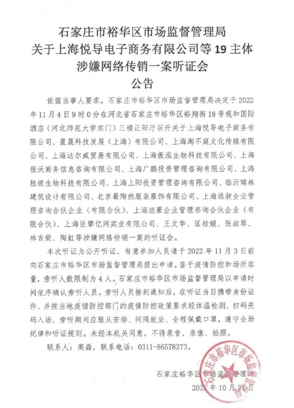 10月31日,据石家庄市裕华区人民政府网站消息,上海悦导电子商务公司等19主体涉嫌网络传销一案听证会将于11月4日在石家庄召开,涉案主体包括艺人张庭夫妇、陶虹等。