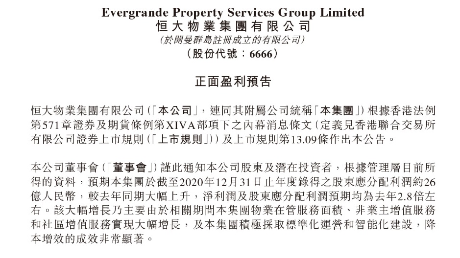 恒大物业(6666.HK)交出上市后首份成绩单。1月7日,该公司发布盈利喜报,预计2020年净利润及股东应分配利润大幅上升至26亿,均为去年同期的2.8倍左右。盈利大增主要是由于物业在管服务面积、非业主增值服务和社区增值服务实现大幅增长,以及公司积极采取标准化运营和智能化建设,降本增效成效非常显著。