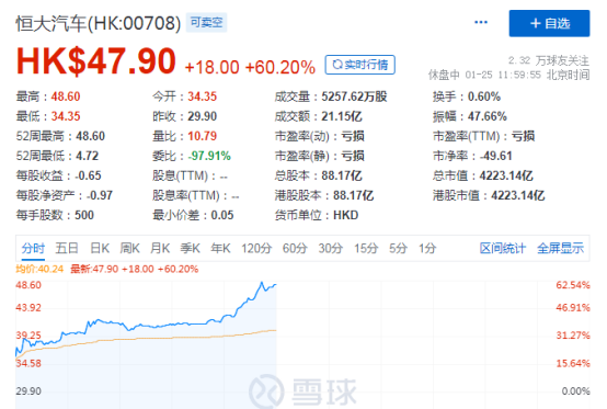不负众望,恒大汽车股票表现强劲,大幅高开15%,并持续攀升,截至中午收盘,大涨60%,报价47.9港元,突破历史新高。