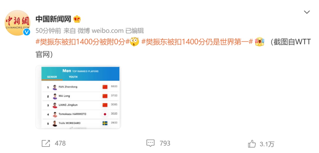 刚刚,“樊振东被扣1400分被附0分”的消息冲上热搜第一。