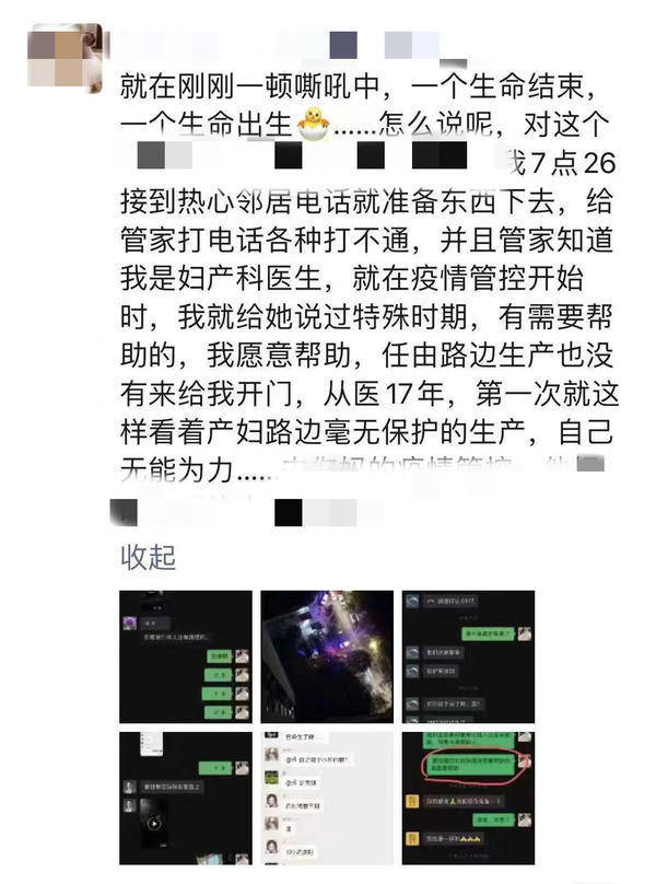 发布该朋友圈的罗医生称,其晚间7点26接热心邻居电话并准备下楼,因其为产科医生,愿意为小区内产妇提供帮助,然而却无人给她开门。
