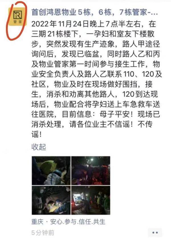 随后,石女士向记者提供了她和当事孕妇所在的首创鸿恩国际小区多位物业人员发布的公告,公告中显示,2022年11月24日晚7点半左右,在三期21栋楼下,一孕妇和室友下楼散步,突然发现有生产迹象。公告中详细描述了事发经过:路人甲途径询问后,发现已临盆,同时路人乙和丙及物业管家第一时间参与接生工作,物业安全负责人及路人乙联系110、120及社区,物业及时在现场做好围挡,接生,消杀和劝离其他路人,120到达现场后,物业配合将孕妇送上车急救车送往医院。