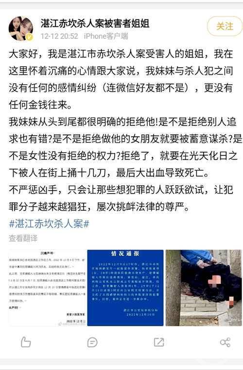 12月9日,广东湛江一名黄姓男子持刀杀害一名女子,当地警方通报称系感情纠纷引发。对此,遇害女子的家人并不认同这一说法,其姐连日来发博反驳称,两人并无感情纠纷,系男子单方面追求未遂行凶。