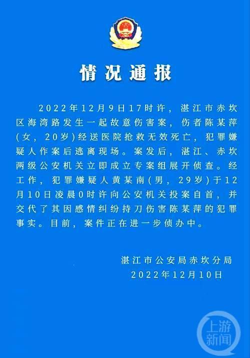 12月10日,湛江市公安局赤坎分局官方微博发布警情通报称,“12月9日17时许,湛江市赤坎区海湾路发生一起故意伤害案,伤者陈某萍(女,20岁)经送医院抢救无效死亡,犯罪嫌疑人作案后逃离现场。案发后,湛江、赤坎两级公安机关立即成立专案组展开侦查。经工作,犯罪嫌疑人黄某南(男,29岁)于12月10日凌晨0时许向公安机关投案自首,并交代了其因感情纠纷持刀伤害陈某萍的犯罪事实。目前,案件正在进一步侦办中。”