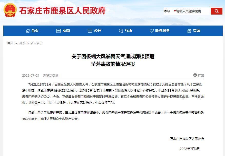 7月2日18时28分,因突发极端大风暴雨天气,石家庄市鹿泉区上庄镇台头村村北牌楼顶冠(钢筋水泥砖瓦混合材质)从十二米处发生坠落,造成正在避雨的9名群众被压。18时35分,石家庄市鹿泉区消防救援大队指挥中心接报后,于18时38分到达现场开展救援。鹿泉区迅速组织公安、应急、卫健等有关部门和镇村干部同时开展救援。石家庄市和鹿泉区相关领导立即赶赴现场指挥救援。至搜救结束,共搜救出9人,其中8人遇难,1人正在医院治疗,生命体征平稳。