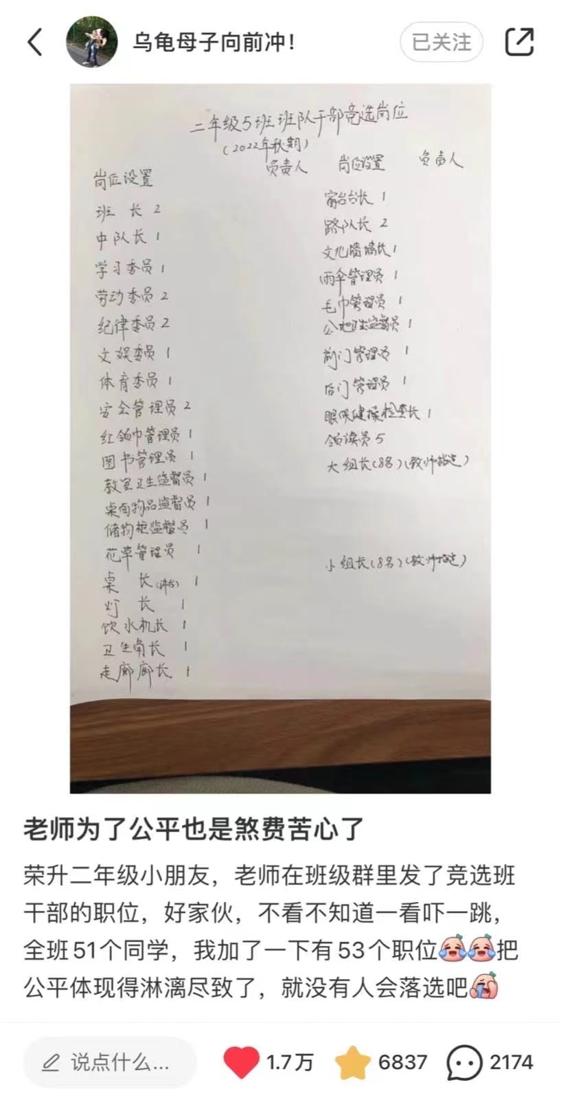 “饮水机长”、“走廊廊长”、“桌长”、“窗台台长”、“前门管理员”……最近,四川一位小学班主任为同学设置的班干部岗位火爆网络。据一名家长介绍,开学第一天,班主任就在班级群发了“班干部竞选岗位表”,为全班51个孩子设置了53个岗位,她的孩子很快从中找到了自己的竞选目标。这篇帖子引发热议,有的网友认为,激励孩子为班级服务,不必人人都当班干部;但更多的网友为这名班主任点赞,认为“老师为了公平煞费苦心”,体现了对每一名同学的善意。