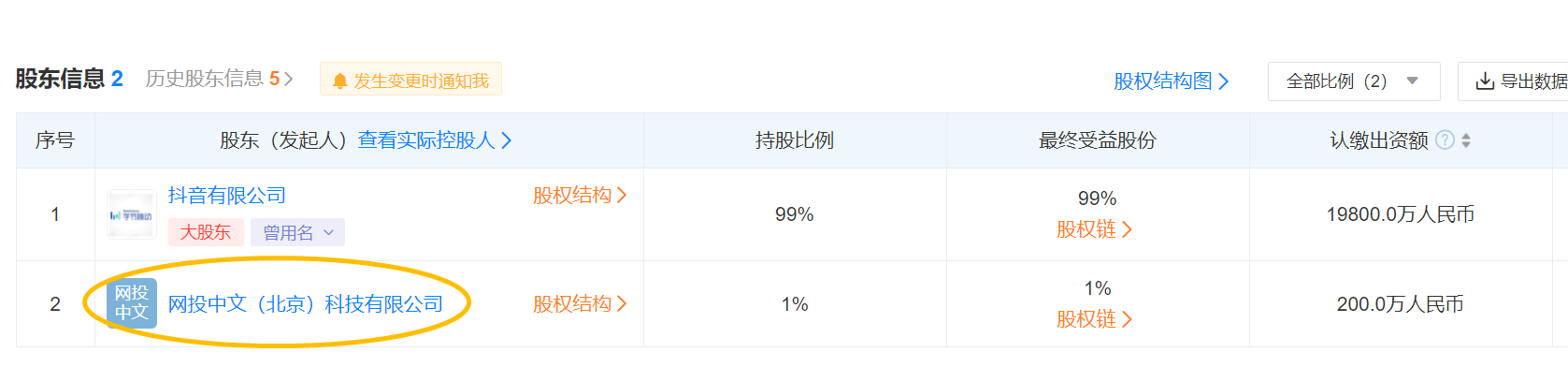 目前,天眼查显示,北京抖音信息服务有限公司由抖音有限公司、网投中文(北京)科技有限公司共同持股,持股比例分别是99%、1%。