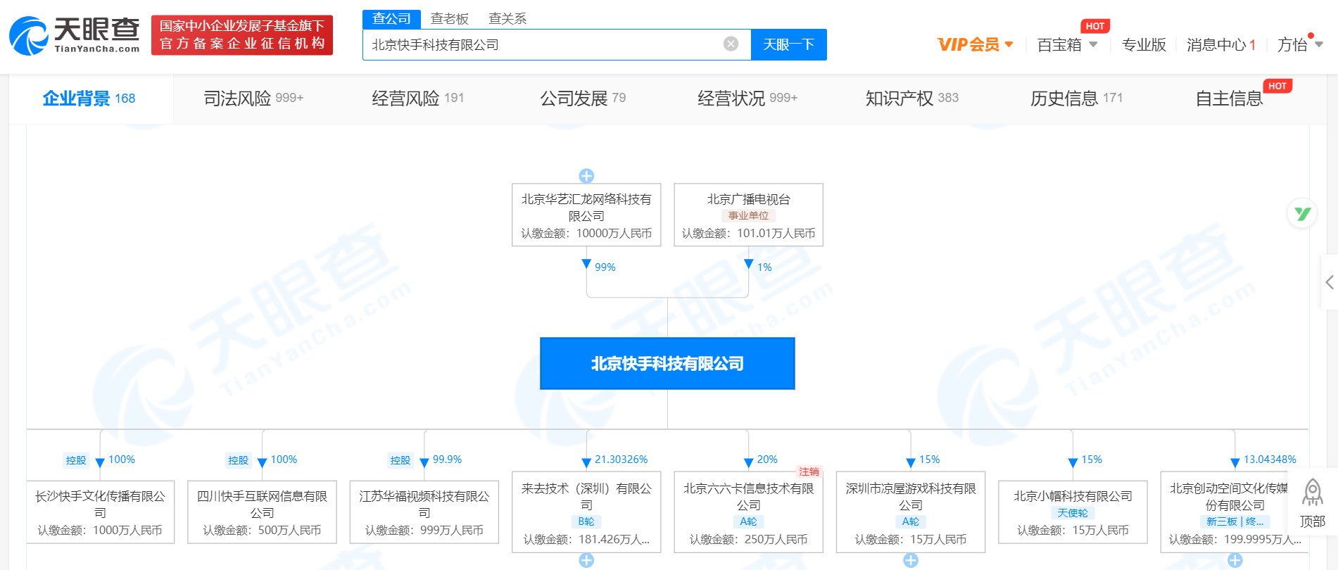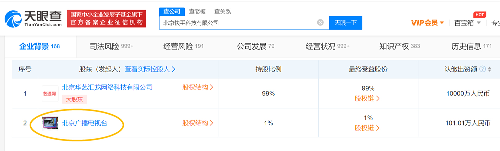 同时,也可以看到,目前快手的两大股东分别是北京华艺汇龙网络科技有限公司(占股99%)、北京广播电视台(占股1%)。
