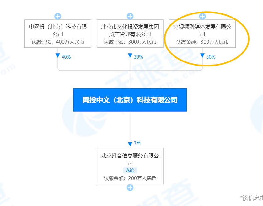 那么,网投中文(北京)科技有限公司是一家什么样的公司呢?通过查询发现,这家公司由中网投(北京)科技有限公司、北京市文化投资发展集团资产管理有限公司、央视频融媒体发展有限公司共同持股,其中,央视频融媒体发展有限公司占股30%。