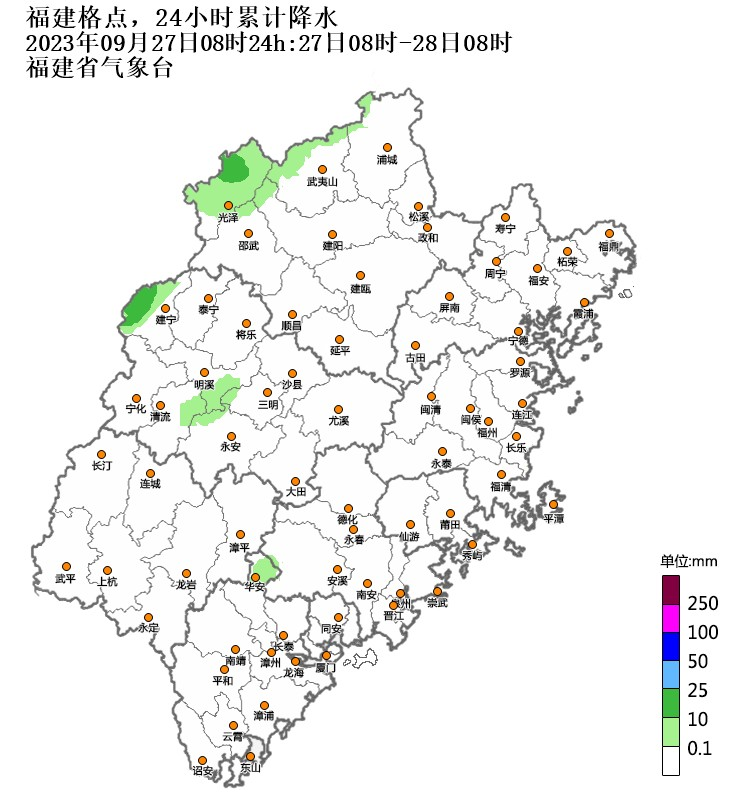 福建省气象台预报,9月29日,全省多云,有分散性阵雨或雷阵雨。9月30日,全省多云,局部有阵雨或雷阵雨。10月1日,全省多云到阴,中北部地区有分散性阵雨或雷阵雨,局部大雨。10月2~6日,全省多云,局部有阵雨或雷阵雨。
