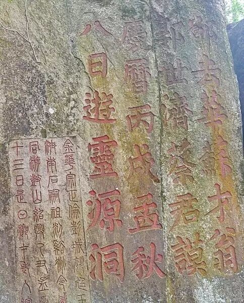 这首诗透露了一个消息:那天,老邵和小蔡他们四个人,是在鼓山上过夜的,山上风很大,月很亮,四个人聊得开心,很迟才睡觉。灵源洞的摩崖石刻,除了刚才说的署名,这首诗也在内。