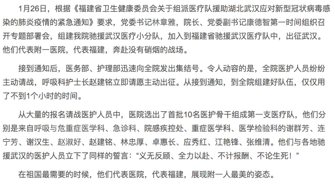 疫情就是命令!1月26日,大年初二,按照省市要求和部署,福建医科大学附属第一医院选派10名医护人员,加入福建省支援武汉医疗队。